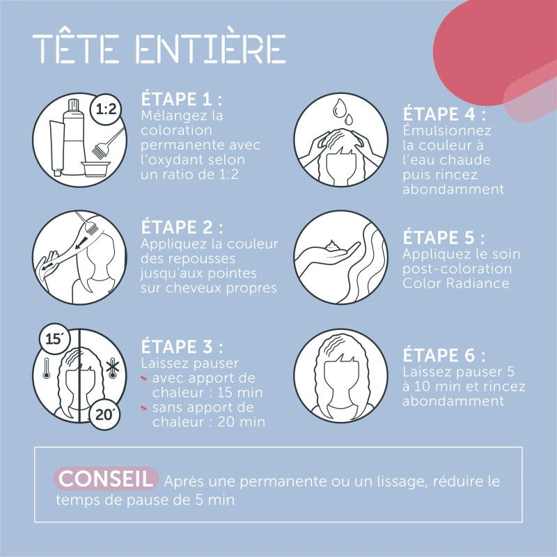 - Appliquez le soin post coloration Color Radiance. Laissez poser 5 à 10mn puis rincez.