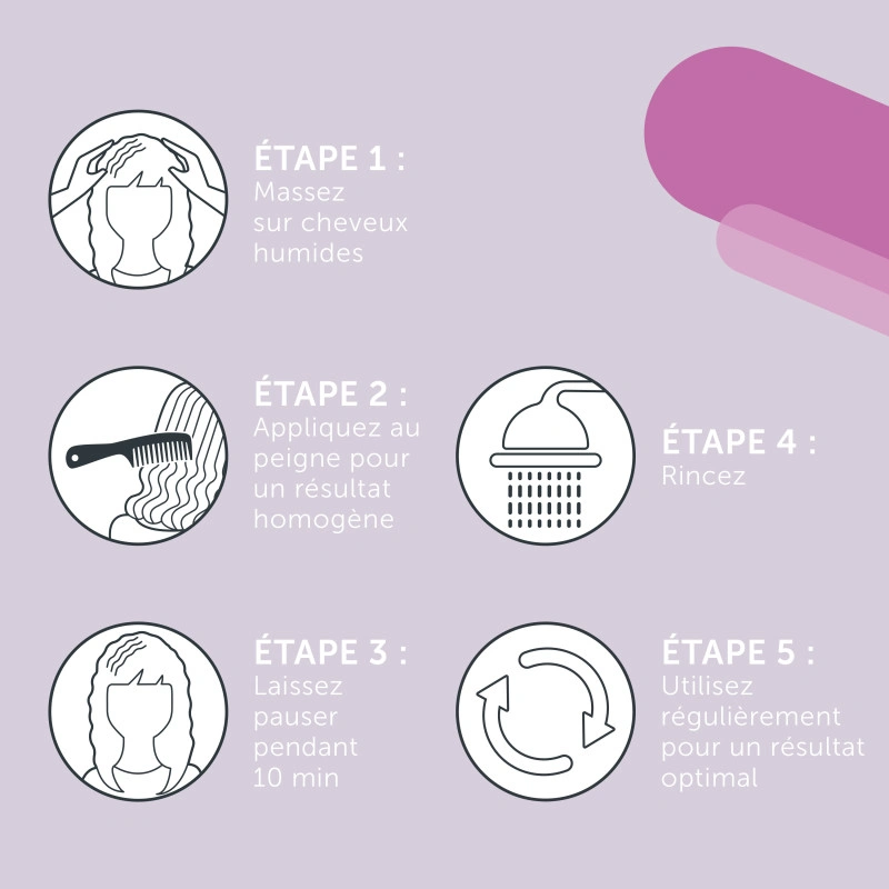 Massez sur cheveux humides et peignez les cheveux pour un rĂ©sultat uniforme. Laissez poser jusqu’Ă 10 minutes, puis rincez. Ă€ utiliser rĂ©gulièrement pour un rĂ©sultat optimal.