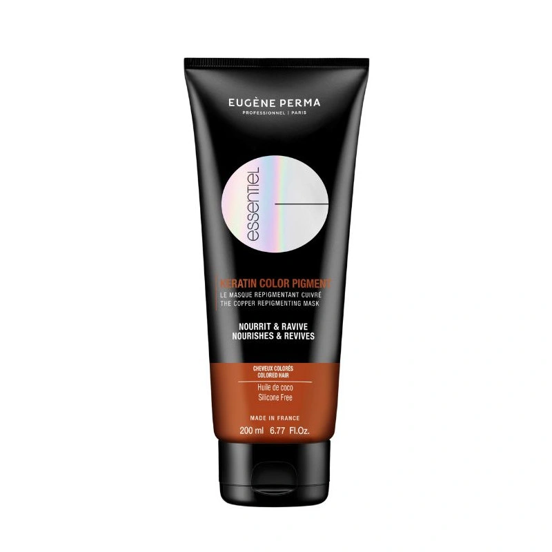 Le masque repigmentant cuivré Essentiel KERATIN COLOR PIGMENT d’EUGENE PERMA Professionnel ravive la couleur dès la première utilisation et prolonge son éclat. La couleur est sublimée, elle retrouve brillance et intensité des premiers jours. La formule enrichie en kératine* et huile de coco renforce la fibre capillaire et nourrit les cheveux sans les alourdir. Sans silicones.
