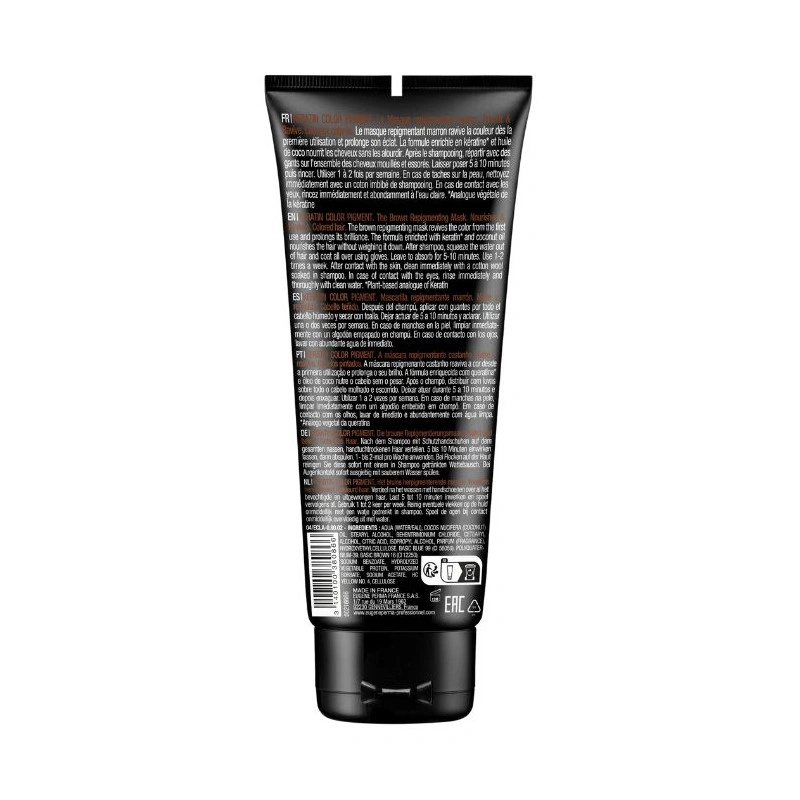 Le masque repigmentant marron Essentiel KERATIN COLOR PIGMENT d’EUGENE PERMA Professionnel ravive la couleur dès la première utilisation et prolonge son éclat. La couleur est sublimée, elle retrouve brillance et intensité des premiers jours. La formule enrichie en kératine* et huile de coco renforce la fibre capillaire et nourrit les cheveux sans les alourdir. Sans silicones.
