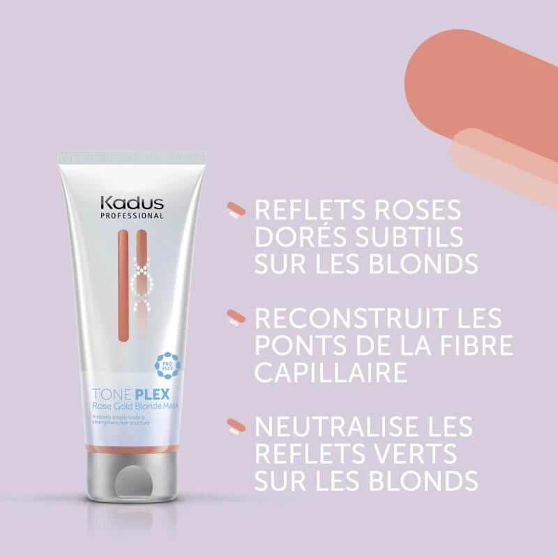 Le masque pigmentant raviveur de couleur Rose Gold Toneplex va rafraichir les blonds chauds aux sous-tons dorés roses tout en neutralisant les reflets verts indésirables.