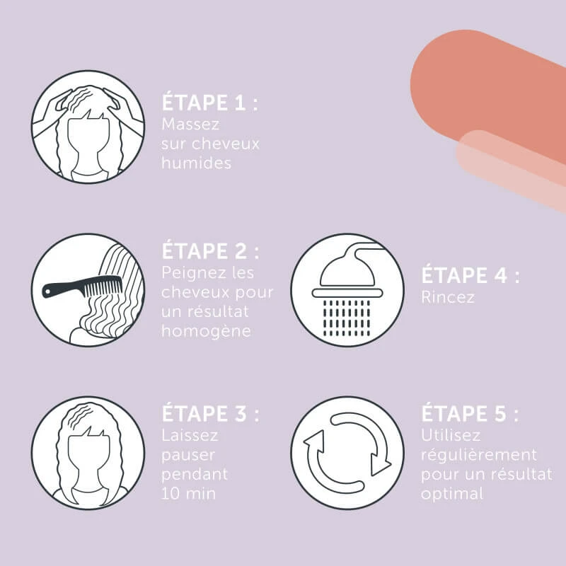 Massez sur cheveux humides et peignez les cheveux pour obtenir un résultat uniforme. Laissez poser jusqu’à 10 minutes, puis rincez. À utiliser régulièrement pour un résultat optimal.